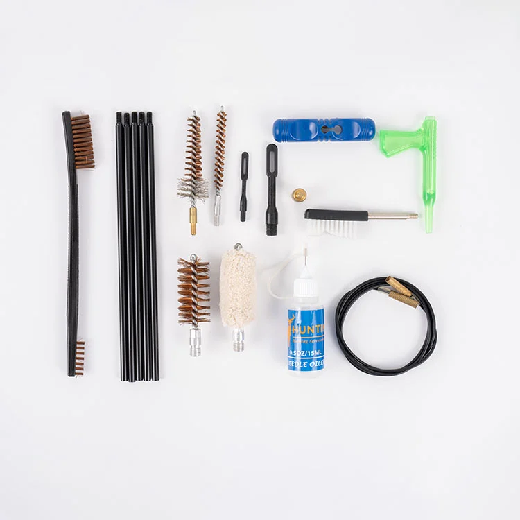 1 mango personalizado, 3 cepillos de orificio (12ga, . 223Cal), 1 cepillo de orificio de cámara estrella (5, 56 mm), 1 iluminador de orificio 3 en 1, 1 trapeador (12ga), 1 cepillo de limpieza con 8-32 hilos, 1 cepillo de limpieza de latón, 1 extractor de parches.